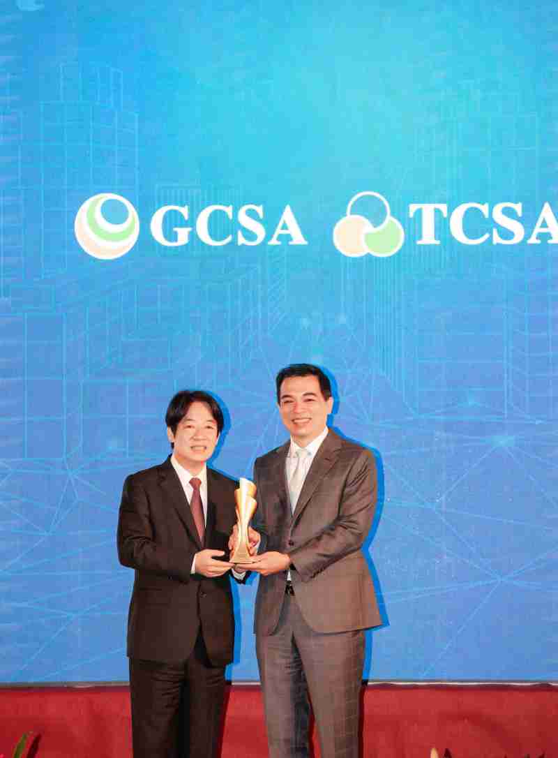 达全方位永续表现获全球永续奖及台湾永续奖肯定,,由副总统赖清德颁奖 (左),,,尊龙集团总经理柯富仁 (右) 代表领奖